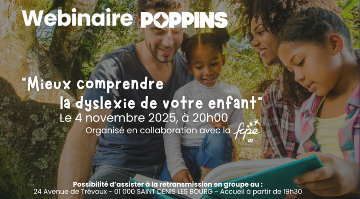 Nous avons le plaisir de vous inviter à ce webinaire « Mieux comprendre la dyslexie de votre enfant » qui se tiendra le mardi 4 novembre 2025 à partir de 20h, en association avec Poppins.
